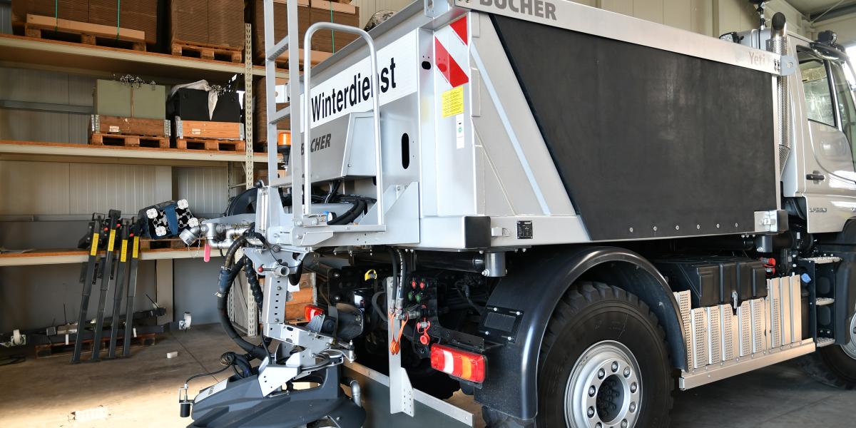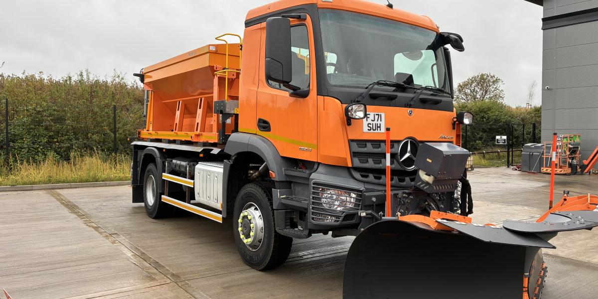 Mercedes-Benz 4x4 Arocs Bucher UniQa E gritter with Unix plough