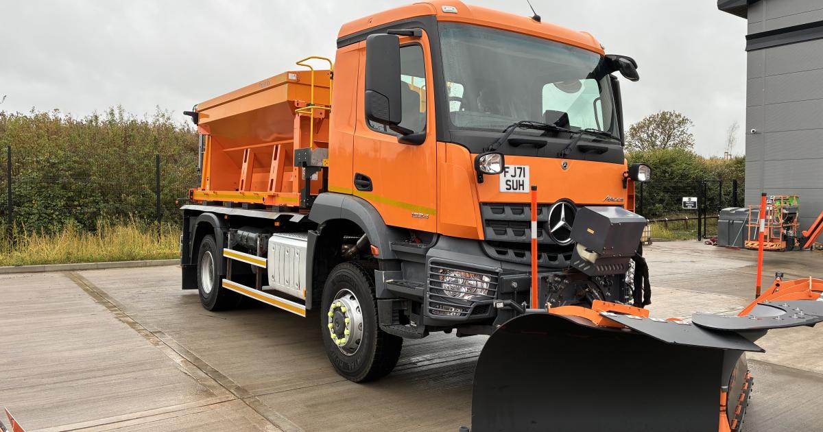 Mercedes-Benz 4x4 Arocs Bucher UniQa E gritter with Unix plough